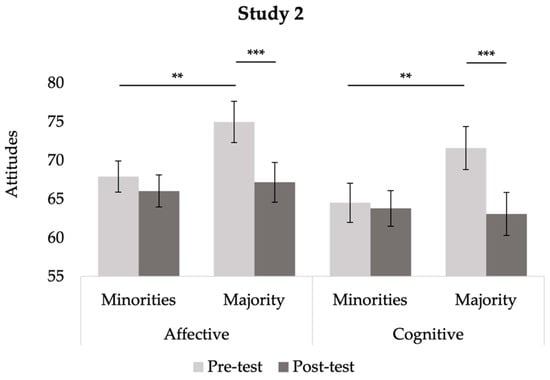 Plot depicting participants’ attitudes towards minorities and majorities at pre-test and post-test within each condition in Study 1. * p < 0.05, ** p < 0.01, *** p < 0.001.