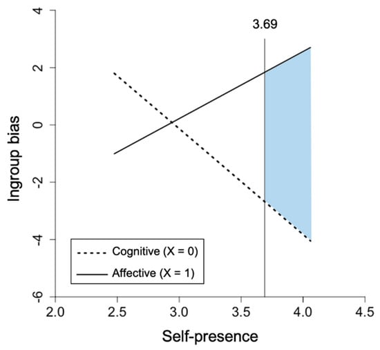 Through stimulating a heightened sense of realism, participants undergo an attitude change in the online world that can be extended to the offline world [,]. For example, participants who experienced a VR simulation of being color-blind were found to be twice as more likely to help a color-blind person compared to participants who had only imagined being color-blind []. Therefore, in Study 2, we investigate the moderating role of self-presence in the relationship between perspective-taking and intergroup attitude.