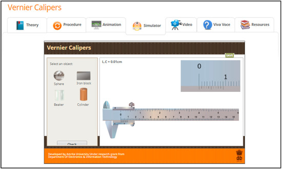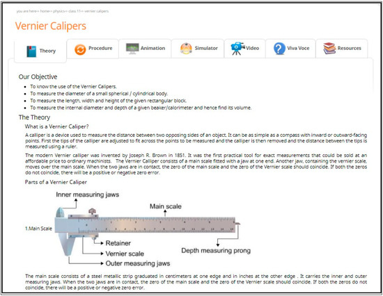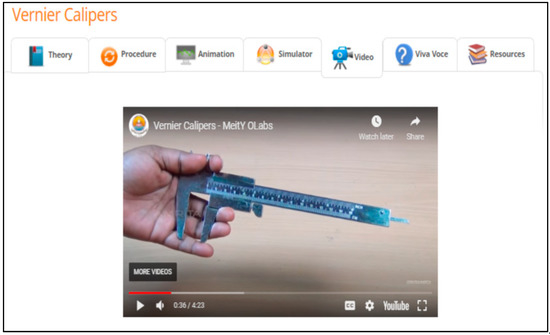 OLabs for school lab experiments provides the ease and convenience of conducting laboratory experiments online using the internet. Experiments can be done less expensively and efficiently. At present, 173 OLabs in physics, chemistry, and biology are available as an open educational resource on http://www.olabs.edu.in/ (accessed on 13 March 2021). All the labs are available in English and translated to local Indian languages including Hindi, Marathi, and Malayalam. For schools with limited internet usage, an offline version is also available. Typically each lab will have 6 to 8 tabs for different skill types, such as theory, procedure, animation, simulator, video, resources, etc., as shown in Figure 1.