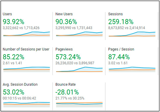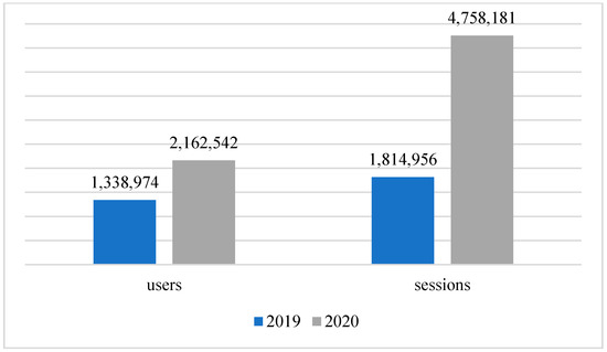 Google Analytics was chosen, as it has already been employed for similar analysis in previous studies. For example, Google Analytics data of the Enocta Academic Education Platform (EAEP) were used to analyze user needs and behavior patterns [34]. A similar approach was used to aid teachers in achieving learning goals of students using the eLearning environment Virtual W [35] and online courses [36,37]. Therefore, this paper uses Google Analytics data on OLabs to study how this platform was used during the pandemic to support laboratory education.
