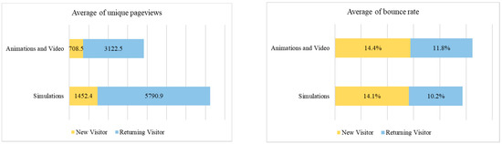 We observe that visitors overall have spent more time with interactive simulations than watching animations and videos. This is confirmed by the average bounce rate (12.3%), which is lower in the case of simulations with more unique page views of the simulations (3621.6), as seen in Table 2. Hence, it can be inferred that there is preference for simulations. Nevertheless, this could also be attributed to the fact that, due to school closures during COVID-19, physical lab work was not possible, making simulations the next best choice to learn by doing.