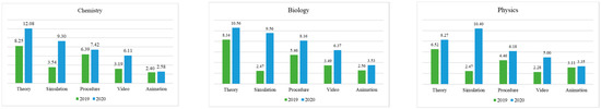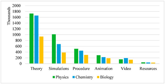 The rich media content consists of animations, videos, and simulations. Most animations and videos are not interactive and designed to understand the underlying concepts and techniques, while the simulations allow for online experimentation. In terms of rich media content, physics had the highest usage in simulations compared with animations and videos put together, followed by chemistry. In biology, considering that many of the experiments are procedural, the simulations were used only slightly more than animations and videos.