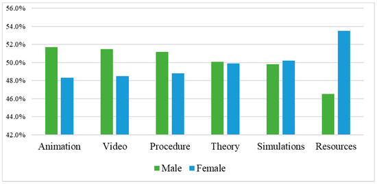 Here we analyzed if the genders behaved differently while accessing different skill types (animation, simulation, theory, etc). In general, a slight variation in gender-based utilization of skill types can be noted, as observed in Figure 10. For example, male learners seemed to slightly favor animation while female learners engaged with simulations and resources. However, the variations were generally minor, and no significant gender bias was observed.