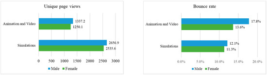 As observed, in Figure 11, male learners had slightly higher unique pageviews (2656.9 vs. 2535.6) and bounce rate (12.1% vs. 11.3%), for simulations, when compared with female learners. Overall, both male and female learners had a preference for the simulations skill type as compared to animation and video.