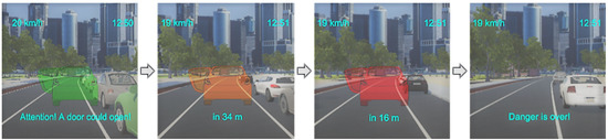 More and more people are using bicycles as an alternative mode of transportation in recent years [1]. In general, cycling is a healthy activity and has a greener footprint than most other modes of transportation [2]. In addition, it saves time on the way to work, as it is often the faster alternative to the car and removes the hassle of looking for a parking space. Unfortunately, however, bicyclists are involved in numerous accidents every day, and—because bicyclists are particularly at risk as vulnerable road users (VRUs)—many of these accidents have serious or fatal consequences [3]. According to the European Traffic Safety Council [4], 83% of cyclists’ accidents result from an impact with a motorized vehicle, and 2160 cyclists are killed in traffic each year in the EU, which is 8% of the total fatal road accidents. In this regard, “dooring” counts as a widespread hazard for cyclists in the city, primarily because of the high risk of serious injury—if not from an impact with the vehicle door, then often from a secondary collision with other road users [5]. These so-called “dooring” accidents occur when a vehicle occupant fails to check his or her surroundings before opening the door (and the bicyclist also fails to anticipate the door opening).