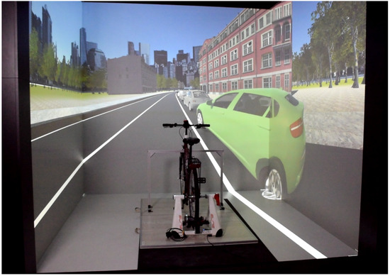 The simulation environment was developed with Unity 3D. The study was conducted in a CAVE, a 3 m × 3 m × 3 m cube with four projection sides. A bicycle (fixed in a roller trainer) was positioned in the CAVE, facing the front side, see Figure 3. The bike was equipped with a tracker for the handlebar angle, measured via ART DTrack, using four infrared cameras (resolution; 0.9 MPx, frequency: 90 Hz). A Bluetooth IMU measured the angular speed of the rear wheel (Mbient MetaMotionR+, framerate: 100 Hz, resolution: 2000°/s, measuring speeds up to 50 km/h for a wheel line of about 2.25 m).