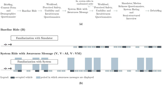 An overview of the study procedure (a) and a schematic representation of the rides (b). The car symbols represent parked vehicles, and the darker cars represent occupied vehicles. The gray areas illustrate an exemplary (not accurate) time period during which the AMs are presented. In each three subsequent occupied vehicles, each door opening type occurred once. Further, we highlighted that the first third of the baseline ride was reserved for familiarizing with the simulator. The first three notifications for occupied vehicles were intended for familiarization with the notification system.