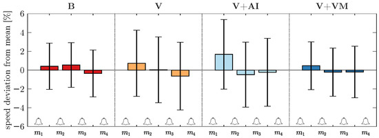 We recorded the cyclist’s position and speed during each ride to assess the impact of AMs on the cycling behavior. One common indicator that a driver is not distracted and is focused on the driving task is that they are maintaining their traveling speed. We assume that—when the proposed AM systems are used—they do not impact cycling behavior negatively, i.e., by distracting the driver and impacting traveling speeds. An often-used measure for driving performance is the Standard Deviation of Lateral Position (SDLP), which can further be used to derive driver distraction [51].