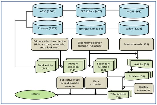 The answer for each question was selected on a rating scale of the three different options, i.e., “good”, “average” or “poor”. The numerical values of all answers were added to calculate the accumulative assessment score for each article. The accumulative assessment score for each article was calculated by adding the numerical value for “good”, “average”, or “poor” options were “1”, “0.5” and “0”, respectively. Articles with 2 or more accumulative scores were included and the remaining were excluded. Articles with per-year citations ≥3 were rated as “0.5” and the remaining were rated as 0 for question 1. For question 2, articles from standard and relevant journals/conferences were rated as “1” and the remaining articles from multidisciplinary lower reputation venues were rated as “0.5” or “0”. Similarly, questions 3 and 4 were also answered after thoroughly reading the articles based on their contributions, novelties, fairness and completeness of the results. In the quality assessments phase 22 articles were excluded.