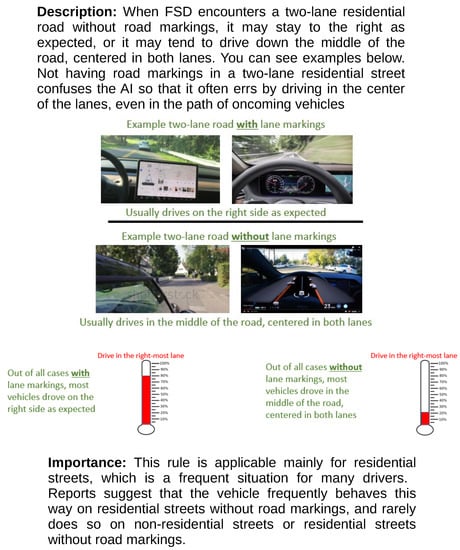 One way to help identify errors, failures, and problems in an automated system is through careful human factors and safety testing. Some of the limitations of the FSD mode have indeed been discovered through careful research evaluating the system with human users. There have been numerous studies evaluating AP, examining various aspects of human–technology integration and identifying the current gaps in knowledge in this domain. For example, Endsley [1] analyzed the first six months of her own driving of a Tesla Model S. She noted that although Tesla’s service representative initially provided useful knowledge, the breadth of experiences that a driver needs in order to become an expert is wide ranging, and learning about the successes and failures of the technology can be ad hoc and must come from multiple sources.