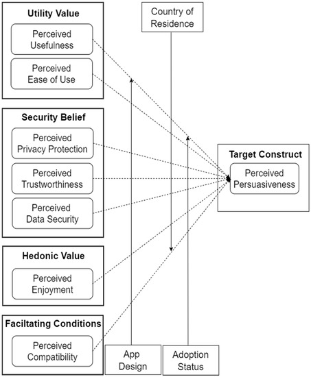 Since the inception of the COVID-19 pandemic, a substantial number of empirical studies have been carried out with regard to CTAs aiming at slowing down the spread of the coronavirus. Many of these studies are aimed at understanding the factors that drive technology acceptance [2,3]. We cover a cross section of the relevant studies. Horvath et al. [4] conducted a study on the adoption and continued use of CTAs to assess within-subject changes over time in England. The authors found that trust in government influenced the adoption of the government-backed National Health Services (NHS) app in the third wave, with continued app use linked to perceptions of transparent evidence on app effectiveness. The authors also found that providing clear information about privacy policy could increase uptake. Similarly, Huang et al. [5] explored the determinants of the Singaporean CTA called TraceTogether. They found that those who perceived the app as useful had a higher likelihood of accepting it. However, they found that those with data-privacy concerns had a lower likelihood of accepting it. Tomczyk et al. [6] conducted a CTA study based on the unified theory of acceptance and use of technology (UTAUT) among social media users. The authors found that perceive usefulness, hedonic motivation, and price value positively influence adoption intentions. Similarly, Walrave et al. [7] studied the technology-acceptance model among Belgians. They found that perceived usefulness, subjective norms, and innovativeness are drivers of users’ intention to use a CTA, while privacy concern is a barrier. Similarly, Abuhammad et al. [8] studied the Jordanian population. They found that perceived benefit and voluntariness are drivers of intention to use a CTA, while privacy and ethical concerns are barriers. Moreover, Sharma et al. [9] studied Facebook users and found that personal and social benefits are drivers of intention to install a CTA, while privacy concerns and perceived risk are barriers. Other authors that have investigated the acceptance of CTAs and found similar results include Velicia-Martin et al. [10], Trang et al. [11], Li et al. [12], and Cruz et al. [13]. Cruz et al. [13] explored the potential effectiveness of persuasive features in promoting CTA uptake among the Brazilian population. Although they found that reward and self-monitoring may be effective in increasing users’ intention to use CTAs, the authors did not implement them. As evident in the review, none of the extant studies, include our prior CTA studies [14,15], focused on the relationship between UX design attributes and perceived persuasiveness, which is an antecedent of adoption intentions [16]. Hence, this paper aims to bridge this gap by examining the said relationships and the moderating effect of country of residence, adoption status, and persuasive design.
