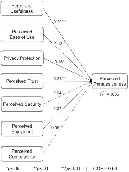 Figure 5 shows the overall model of the relationships between the predicting and target constructs. The numerical values on the links, also known as path coefficients (βs), indicate the strength of the relationship between each pair of constructs. The coefficient of determination value (R2) for the target construct indicates the amount of variance of the target construct explained by the predictors. The goodness of fit (GOF) captures how well the model fits its data. In the overall model, the GOF is 63%, which is an acceptable value within the PLSPM community [29]. That said, 55% of perceived persuasiveness is explained by the predictors, with perceived usefulness (β = 0.29, p < 0.001), perceived ease of use (β = 0.12, p < 0.01), privacy protection (β = 0.16, p < 0.05), and perceived trustworthiness (β = 0.24, p < 0.001) being significant. The R2 value of 55% is classified as moderate, given that it is between 0.30 and 0.60 [29]. The results presented in this paper were initially presented in the 2022 Human Factors and Ergonomics Symposium [31]. However, a full paper corresponding to the results was not submitted for publication.
