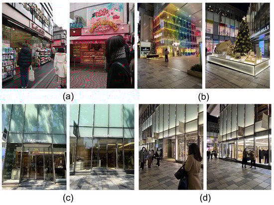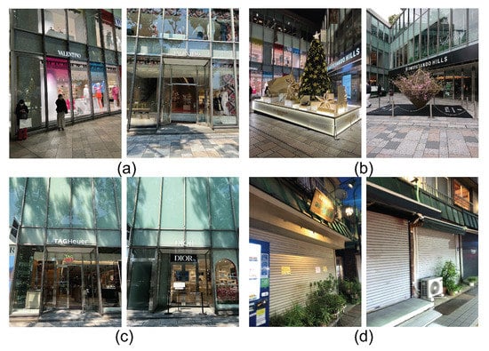 Recognizing places using visual information is studied as Visual Place Recognition (VPR). It is widely studied for localization and SLAM tasks which demand high precision [,]. In contrast, this work aims to recognize urban places of interest (POI) depicted on an image as a visual search task and there has been a scarce focus on it. Landmark recognition is a closely related task and a number of studies [,,,] have adopted an image retrieval approach. However, in addition to landmarks that display distinctive features, urban POIs include business entities (e.g., shops, restaurants) and commercial buildings (e.g., shopping malls, offices). Additionally, urban environments go through frequent appearance variances (i.e., structural, seasonal, and illumination changes) and display perceptual aliasing (i.e., two distinct places appearing visually similar) (Figure 1). Therefore, visual similarity alone is not robust against these challenging conditions [].