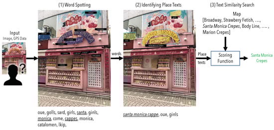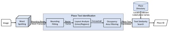In this stage, previously identified place text candidates are matched against the location-relevant listed place names to obtain top K place recognition results. The location-relevant subset is obtained by filtering places within a radius value (r) from the query location (Equation (4)).