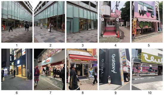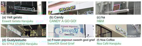 All images are collected from Tokyo, Japan, in several rounds. Specifically, they were collected in Harajuku, Omotesando, and Yanaka areas using the mobile devices Sony SO-04J, Apple iPhone X, and 13 Pro Max. The images contain GPS information, including latitude, longitude, and horizontal positioning error in metadata. The dataset includes a variety of challenging instances (Figure 6), including varied font styles, font sizes, arbitrary shapes (including horizontal, curved, and vertical), environment conditions (general, illuminated, and seasonal), and perceptually aliased. Perceptually aliased images are collected from a shopping complex with more than 15 stores (with similar storefronts) facing the street. Night-time images are collected during the Christmas season and therefore, display both illumination and seasonal appearance variances. Even though both English and Japanese texts are available in the environment, the presented query set is limited to English place name texts.