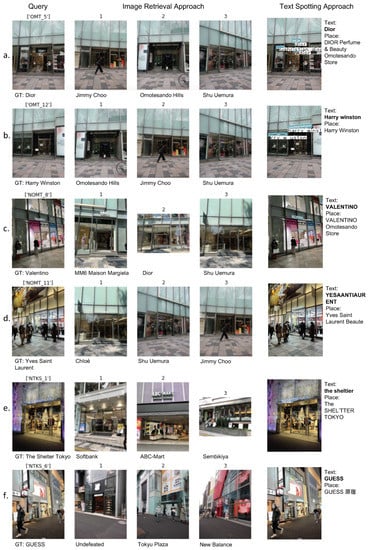 VPRText has many advantages over an image retrieval approach. The image retrieval approach’s success highly depends on the quality of the database; it requires several images of a place from different viewpoints and under varied conditions []. In addition, image descriptors should be created and stored [,]. Therefore, the creation, maintenance, and storage of the database is an extra overhead. In contrast, the text-based approach only requires a simple directory of place names and locations. The coverage is easily expandable since text search queries can easily be made to a third-party service (e.g., search engine, mapping service) to retrieve information, without depending on a single database. Image retrieval is an expensive process, given a query image; it requires the descriptor creation, image similarity measuring against the database, and optionally further re-ranking for result refinement [,,]. Whereas, the text-based approach requires only the processing of the query image, followed by simple post-processing, which is cost-efficient. Additionally, the image retrieval approach fails to separately identify multiple POIs located in the same building []; the text-based approach is capable of handling the challenge.
