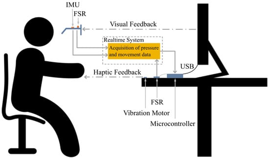 The concept of the alternative mouse and keyboard interface is described in Figure 1. The user is outfitted with spectacles that include sensors for controlling the cursor position on the screen and for activating mouse clicks. The generated signals are acquired by a microcontroller, which in this case is an Arduino Mega with an ATmega2560 processing unit that allows for real-time processing in this application. The microcontroller is connected directly to the computer via a USB cable. The alternative keyboard, consisting of ten buttons based on FSRs, is also directly wired to the microcontroller for signal processing. Vibration motors are placed where the wrist or forearms usually rest while typing, as shown in Figure 1, and these are used to provide haptic feedback to the user for each press of the button.