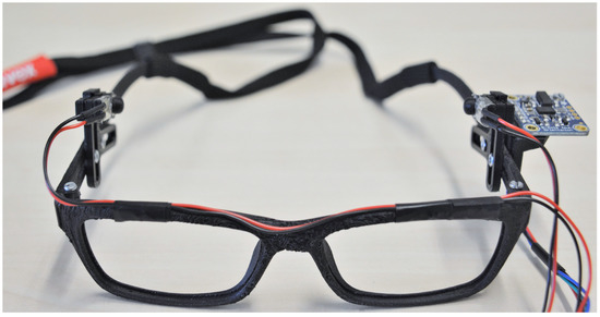 The alternative mouse has been redesigned with respect to the frame for enhanced head tracking and most importantly, for greater adjustability of the overall fit in order to provide more reliable mouse click activation across users. The adjustments will be described in more detail in the mentioned order within this section. The frame of the spectacles is now available in three different sizes, with the smallest frame measuring 130 mm in width (measured between both spectacle hinge screws), while the medium and large sizes being and wider, respectively. To allow for a less obstructive use of the mouse alternative, lighter cables are used to connect the sensors of the spectacles to the microcontroller, which significantly decreases the strain. Furthermore, all cables are guided to the microcontroller via the left side of the frame; therefore, all cables now come from one side, as shown in Figure 3, which facilitates taking the spectacles on and off.