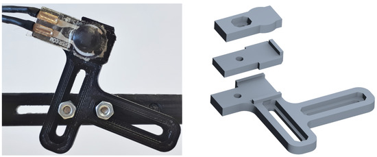 Mouse clicks can be triggered through the activation of the masticatory muscles. Therefore, the two FSRs were placed on the Temporalis muscle, in the temporal region where the elevation due to muscle tension is most pronounced. This area varies between each person, and so a calibration plate, shown in Figure 5, was designed to place the FSRs at the optimal position to acquire the best possible signal. The calibration plate can be moved along the temple within a 13 mm range, through the recesses in the temple and the plate itself; it can also be tilted up or down within a range of 14 mm by two M2 screws. Furthermore, the firmness of the contact between the FSR and the skin over the Temporalis muscle can be adjusted through spacers that range between 1 mm and 5 mm, with 0.5 mm increments. This same extent was not possible with the previous design by Gür et al. [9]. The right image in Figure 5 shows an exploded view of how the calibration plate and the FSR are connected to each other, with the calibration plate at the bottom, the spacer in the middle, and the FSR support structure at the top. The support structure for the FSR contains a recess for an M2 nut and is secured by some tape that also fixates the FSR. A screw can be used to connect the three parts by putting it through the inserted nut. The spacer system was designed in a way that each component could be joined securely to the connecting parts without allowing for any unwanted movements during use and to assure reliable signals. This is still the case when no spacer is used and the FSR support is directly connected to the calibration plate.
