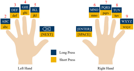 The ambiguous keyboard layout used in this work was partially adopted from works by Abrams et al. [8] and Gür et al. [9] and was based on the scanning ambiguous keyboard approach using a ten-key layout by MacKenzie et al. [13]. The latter eliminates the need for the user to move any of their fingers while typing as it takes into account the possible movement restrictions of the target group. Multiple letters are assigned to each key, as shown in Figure 6. To type “hello world”, for instance, the user needs to enter “43556” first, which corresponds to the letter sequence of the word “hello”. Since several words match this key input, the user then needs to select the desired word from a list of suggested words by pressing the next key with the left thumb. The word can then be entered by pressing the space button with the right thumb, which will also automatically enter a blank space behind the word so that the user could directly continue typing the next word “world” by putting in the sequence 96753.