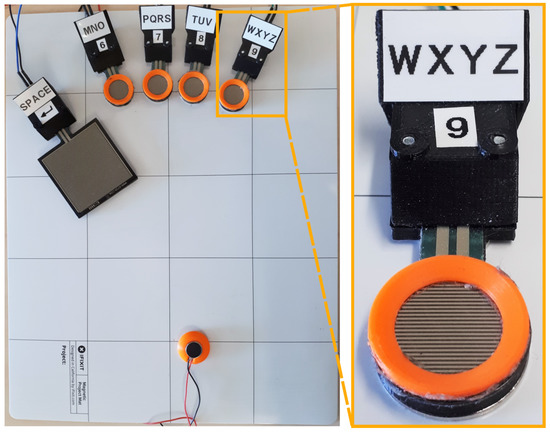 A few modifications were made to the mechanical button design in order to improve the typing experience. Due to the flat shape of the FSRs, fingers could easily slip off the sensor. To resolve this issue, a support ring was designed and attached with an adhesive to the top of the Interlink 402 FSR without covering the 14.7 mm diameter active sensor area in the center, as shown in Figure 7, thus maintaining the sensor’s sensitivity. Additionally, naming indicators were added to each of the buttons so that the user would know which letter or function keys were bound to which button at all times. Since hand and finger positions can highly vary between each user, the naming indicators were elevated and shifted backward in order not to be covered by the fingers while typing, which can be seen in Figure 7. The thumbs are positioned on the larger Interlink 406 FSRs, which have a square active area of 31.8 mm × 31.8 mm. Thus, a support structure to keep the fingers in place is not necessary here. To accommodate the varying hand shapes and sizes of different individuals, the buttons were then mounted onto a magnetic pad that allows the user to freely but stably arrange the buttons in order to adopt a comfortable hand position for longer use with less fatigue.