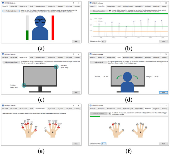 User interface during the guided calibration process. (a) Calibration of the force between the sensor and the Temporalis muscle. (b) Calibration of the threshold to activate a mouse click. (c) Calibration of the cursor sensitivity based on screen size. (d) Calibration of thresholds for scrolling. (e) Calibration of the keyboard layout based on usable fingers. (f) Calibration of the duration from a long button press.
