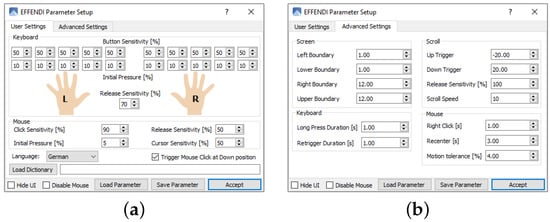 Setup window of the desktop application to load previously calibrated user data or perform manual changes. (a) User settings to adjust keyboard and mouse sensitivity. (b) Advanced settings to further customize user parameters.