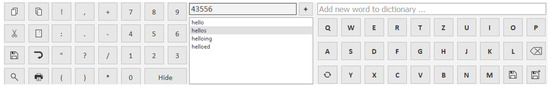 The desktop application’s user interface (UI) will then appear, which is always set to stay in the foreground above all other windows and has an opacity of to keep content behind the UI visible, which can be seen in Figure 2. The UI will appear at the bottom center, right above the taskbar, which is also shown in Figure 2. The UI now gives the user the option to make use of useful hotkeys, including copy, paste, cut, select all, save, revert, find, and print. In addition, the UI provides special characters and numbers that can be accessed through the alternative mouse, as shown on the left of Figure 10. Furthermore, the UI shows the suggested words in the center block, which are for the keyboard input of the user that is shown right above. In case a word is not contained in the dictionary, the user now has the option to add it manually through an on-screen keyboard. The user will have to click on the “+” symbol next to the field with the keyboard input. The UI will then be extended to the right with an on-screen keyboard, where words can now be added by typing the desired word using the alternative mouse, followed by a subsequent click on the save button in the lower-right corner. By using the button with the two arrows arranged in a circle in the lower-left corner of the on-screen keyboard, the user can save the updated word frequencies to the currently used dictionary.