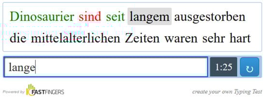 Typing test that was custom-created through the website “10fastfingers.com” [26], with the remaining time shown at the bottom right. Correctly entered words are marked in green and false words are marked in red.
