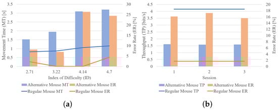 Graphs to compare the performance of the alternative mouse to the regular one. (a) MT and ER plotted over ID for the alternative and regular mice. (b) TP and ER plotted over sessions for both mouse input devices.