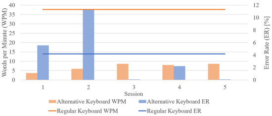 Figure 14 shows the average amount of WPM and the ER plotted over the five sessions for each input device. ER is derived by dividing the falsely entered words into the sum of correctly and falsely entered words. For the first two sessions, the ER was much higher when the alternative keyboard was used as compared to the regular one. Since the alternative keyboard was new to all participants, this was to be expected as users first need to adapt to the system. For sessions three to five, this changed in favor of the alternative keyboard, which had a lower ER as compared to the reference value of the regular keyboard. It should be noted that typical typos did not lead to an increased ER for the alternative keyboard due to the user selecting the desired word from a compiled suggestion list. A typical typo would thus lead to more time needed per entered word, resulting in less WPM, while the ER would only be affected by miss-selections from the word suggestion list. Overall, the performance of the alternative keyboard, with an average of WPM over sessions three to five, is much lower compared to the reference value of WPM, but it outperforms the scanning ambiguous keyboard of MacKenzie and Felzer [13], reaching WPM for the last text block. Moreover, it is promising to see an improvement by a factor of with respect to WPM for the alternative input device when comparing the average performance of sessions three to five to the first session. With more practice, it is expected that even better performance will be seen once the user familiarizes themselves with the system by memorizing the letters assigned to each key, thus allowing them to focus solely on the word suggestion list.