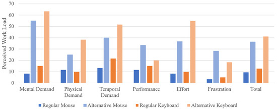 Perceived workload for six subscales of the Raw-TLX questionnaire, for the alternative and regular input devices.