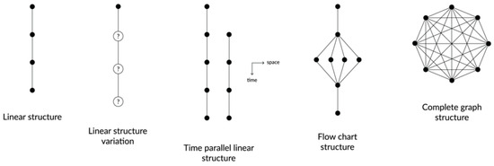 The narrative structure is the structure formed by the narrative events. Individually, a narrative event functions as an episode in a story, as several events correspond to several microstructures that form a narrative sequence [46]. In order to map the narrative structures present in the cases studies, the underlying structure of each visualization was sketched by splitting it into events. This resulted in five types of narrative structures (see Figure 2), which are often combined with each other: (1) a linear structure; (2) linear structure variation; (3) a time parallel linear structure; (4) a flow chart; and (5) a complete graph.