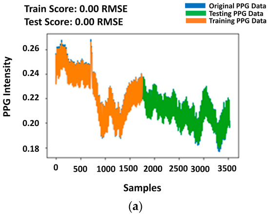 Time series prediction with Bi-LSTM using two different training/testing splitting ratios (a) 50/50 and (b) 80/20 in Subject 3′s PPG data from Figure 2.