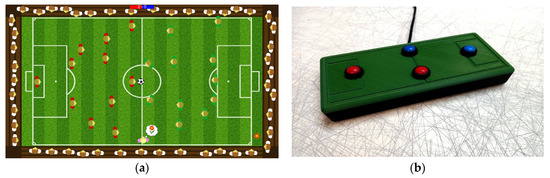 Images from the game Futebolástico! (a) Screenshot of the gameplay; (b) Physical interface of the game.