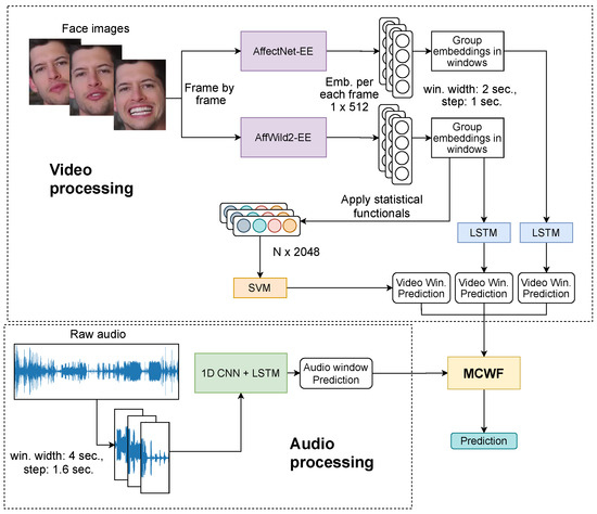 The proposed pipeline for the multimodal emotion recognition system: Emb.—Embeddings, Win.—Window, MCWF—Model- and Class-based Weighted Fusion.