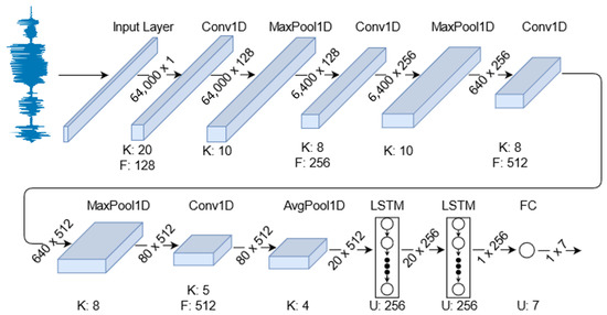 Since there is no publicly available pretrained 1D CNN on raw audio, we constructed our own. To grasp the temporal information from 1D CNN embeddings more efficiently, we stacked two LSTM layers on top of it. The final layer had seven softmax neurons to match the number of classes. To represent window temporal modeling, the sequence-to-one modeling scheme was implemented. It maps one portion of the input acoustic raw data (for example, 4 s of audio) into emotional category probabilities. The number of model parameters was around 4.5 M. The architecture of the developed sequence-to-one model is presented in Figure 2. We would like to note that such a model is also an E2E model since it directly maps the raw audio to one of the emotion categories (or class probabilities).