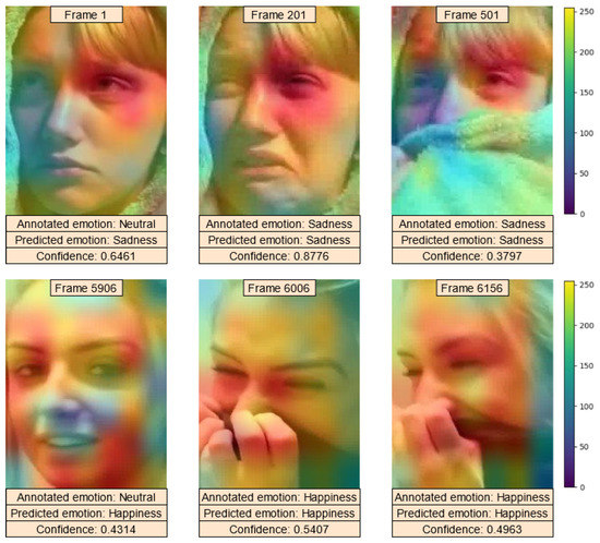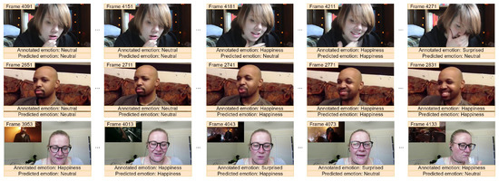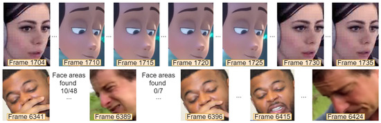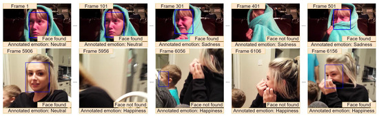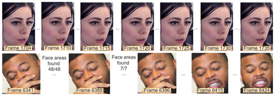 The noticed problems highly contributed to the effectiveness of the model training due to the loss of important information, consequently affecting the efficacy of the temporal aggregation and recognition. To eliminate the second problem, we exploited the RetinaFace detector [84], which works more accurately, including the cases when the face is covered by obstacles by more than 50% [85]. We tackled the first problem as well by utilizing the pure VGGFace2-model: we extracted the facial embeddings from the preceding and the current frames and compared the embeddings, using the cosine similarity. In case the cosine similarity is more than 0.5, the current face is considered as a correctly detected area. We can observe the higher reliability and accuracy of the obtained face detection approach in Figure 5. In comparison with the HeadHunter face detector, no faces were missed, and all of them were identified correctly.