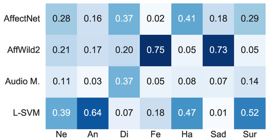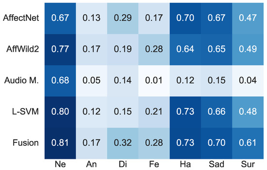 Motivated by these developments in multimodal emotion recognition and the recent outstanding performance of deep learning in the audio [48,49] and video [50,51] domains, as well as the performance of deep transfer learning to alleviate data scarcity in the target problem [40,52,53], in this study, we employed both deep end-to-end learning and deep transfer learning for both audio and video modalities, fusing the scores of the uni-modal subsystems for multimodal affect recognition in out-of-lab conditions. We experimented with and used the official challenge protocol for the ABAW challenge, the Facial Expressions Sub-challenge (ABAW-FER Challenge), originally run for Face and Gesture 2020, but later extended until October 2020. This sub-challenge includes Ekman’s six basic emotions plus neutral, thus featuring a seven-class classification task.