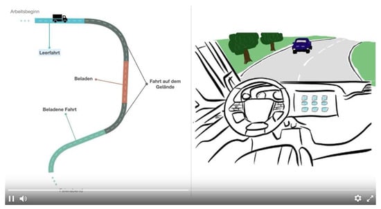 After initial participant information was presented containing a data privacy statement and the goal of the study, a short video explaining the functionality of an AUI was shown (Figure 6). It contained an abstract description of an AUI for trucks based on previous research [,], which explained the system’s functionality in general. The AUI’s schematic representation and basic description is based on a previously conceptualized system which defines the current working phase as the system’s context [] and presents currently relevant vehicle functions to the driver via dynamic control elements [].