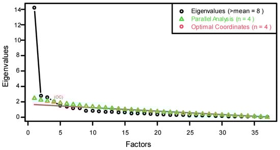 The KMO verified the sampling adequacy with a value of KMO = 0.78. Five items showed insufficient MSA values (<0.5), requiring them to be excluded from the analysis and subsequently from the questionnaire. The KMO value of the revised questionnaire resulted in an increase in the KMO value up to 0.84. Bartlett’s test for sphericity was significant, χ2 (666) = 2.019 (p < 0.001), confirming that the item correlations were sufficiently large to conduct a PCA. For determining the number of components to be extracted, the Kaiser’s criterion, scree plot and parallel analysis were compared (Figure 7). The Kaiser’s criterion, also called eigenvalues, indicated eight factors. Based on the correspondence of the scree plot and the parallel analysis, as well as content considerations, four factors were extracted for the final analysis.