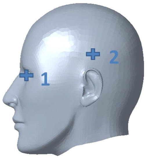 - The visor must be tiltable.The declination angle of the HMD is defined as the angle between the reference line that connects the top of the ears to the corner of the eyes and the optical axis of the display. The importance of the declination angle of the HMD is a key ergonomics factor. This requirement derives from the position of the surgeon when they are standing alongside the surgical table during most procedures. In this working position, surgeons usually prefer to direct their gaze downwards rather than tilting their neck to prevent work-related pain and injuries, especially when they have to maintain the position for a long time. The maximum head tilt recommended by ergonomic professionals is < []. A gaze rotation of about downward is sufficient to view the patient without forcing neck rotation. Studies conducted by Takagi et al. [,] have demonstrated that the best position of the axis of rotation for display tilting is around the x-axis of Fick [], as shown in Figure 1, which is the horizontal axis that passes through the center of the eye and enables its pure vertical movement to preserve the quasi-orthoscopic setup of the HMD in VST mode as much as possible. For this reason, this requirement has been transposed as follows: rotation around the x-axis of Fick up to 30.Figure 1. Rotation axes: axis 1 for downward movement around the x-axis of Fick, while axis 2 is for the upward movement.