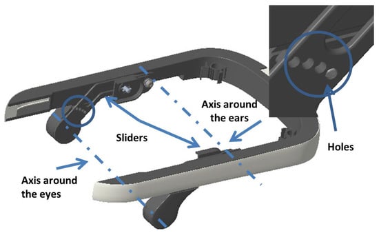 In our solution, this is a real handle system that operates with a mechanism that we will now describe in detail. From a kinematic point of view, the handle has two different rotation axes linked by two sliders placed on both sides of the surgeon’s face: one axis corresponds to the x-axis of Fick’s coordinate system, which defines the axes moving with the eye [,], which hereinafter we will refer to as rotation around the eyes, passing through the eyes’ center of rotation as requested by requirement 4, whereas the second axis passes above the user’s ears and will be hereinafter be referred to as rotation around the ears, as shown in Figure 1.