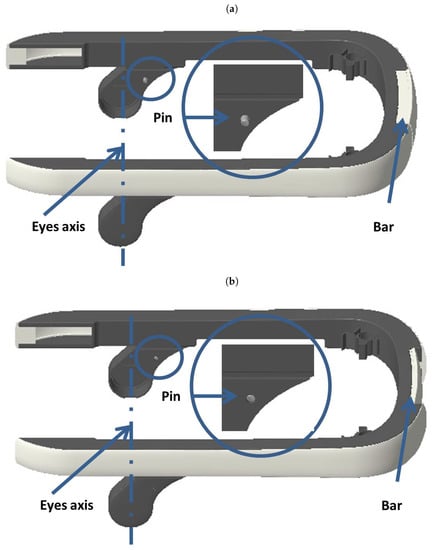 In normal conditions, the system is engaged and stable. As shown in Figure 4, by pushing a bar that is almost hidden inside the handle, the assistant activates a kinematic chain that unlocks the handle when the pins are pressed inside. In this way, the assistant can start rotating the visor around the eyes and release the bar. When the visor reaches more or less the desired angle, the assistant can simply continue the rotation until the pins snap inside the each holes of the slider (corresponding to the desired inclination) with a “click”.