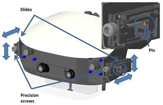 The pair of stereo RGB cameras are anchored to the displays to form a pair of camera/display modules (one for each side), and the IPD can be adjusted by loosening and tightening dedicated screws, as prescribed by requirement 3. As mentioned in [], the RGB cameras are placed as close as possible to the user’s eyes so as to preserve a quasi ortho-stereoscopic vision in VST mode. Moreover, the two displays are tilted downward and convergent to intercept a fixation point at around 40 cm from the user (i.e., the average working distance for a manual procedure). The shift from VST and OST mode is made possible by two customized, electrically controlled, optical shutters placed in front of the displays, manufactured by LC-Tec Displays AB, Sweden []. These are transparent when the system works in OST mode and become opaque in VST mode. In order to meet the requirement 2 and improve comfort, and particularly to avoid excessive contact pressure or prevent sweat between the rear part of the visor and the surgeon’s forehead, we can adjust the frontal part with respect to the handle system by setting it with up/down and near/far movements. These mechanisms are inserted inside two lateral guides which connect the handle system with the frontal part. The near/far movement is guided by two precision screws, while the up/down movement is set manually by changing the position of two pins in a discrete way. The range is 4 mm up and 6 mm down with a step of 2 mm, as shown in Figure 6.