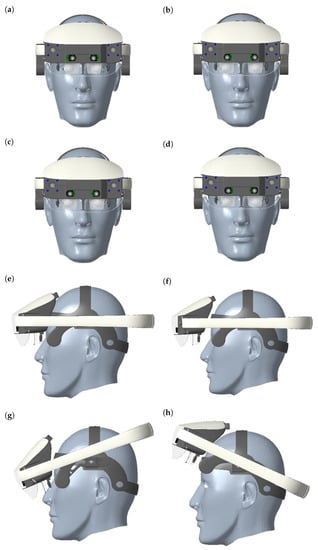 VOSTARS HMD mechanical solutions: (a) Displays with interpupillary distance set at 56 mm. (b) Displays with an interpupillary distance set at 70 mm. (c) Frontal part shifted 6 mm downward. (d) Frontal part shifted 4 mm upward. (e) Frontal part at minimum horizontal stroke. (f) Frontal part at maximum horizontal stroke. (g) Visor at maximum downward tilt for use in a surgical scenario. (h) Visor in stand-by upward condition.