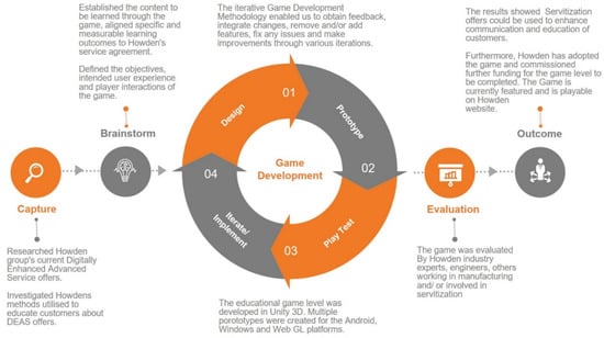 Alternatively, the serious games model embeds specific learning outcomes in the design of the game and the learning objectives are met through playing and/or completing the game. Such games are designed with a defined learning specification in mind and the game is developed keeping the learning goals at its core. The serious game model can empower the developers to design bespoke pedagogical processes and apply user-centered design (UCD) when making the educational game [40,41]. UCD methods allow game designers to incorporate end-user’s needs into each design phase and develop the game iteratively. Serious games typically offer training and/or simulation as part of the gameplay [42]. There are only a limited number of studies that have adopted the serious game model when using game-based learning to convey servitization.