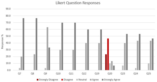 Quantitative means were used to establish the effectiveness of the prototype game. The study included a total of 27 questions that were required to be completed after the participant had played the game. In addition to Likert scale questions, demographic questions, multiple-choice questions and open-ended questions were included in the questionnaire. The development of the questionnaire was based on previous studies that explored the use of emerging technologies and innovative solutions such as VR, 3D, Serious Games, Gamification, and Artificial Intelligence (AI) to convey complex information to particular groups of users [3,6,55]. The main categories of questions used are presented in Table 2 and described below: