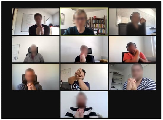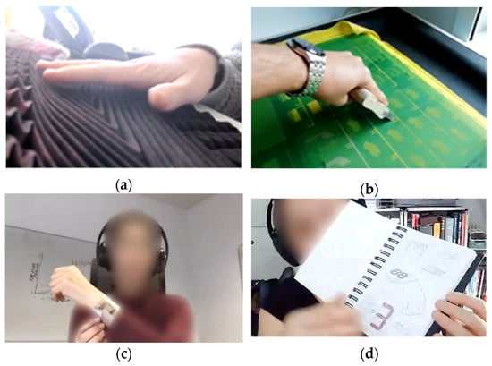 Participants interacted with these sensory touch objects (Figure 1) intuitively and occasionally in response to the interviewer’s prompting. They used them to demonstrate or re-enact an experience or process or to illustrate a tactile feature (e.g., thinness and flexibility), concepts (e.g., social acceptance and skin markers) or ideas (e.g., manipulating objects to show how the body interprets and categorises sensation). While the visual display of tactile interaction afforded by Zoom and the empathetic character of sensory research encounters offered a relatively weak pathway to participants sensory experiences, we sought to strengthen this by introducing the method of ‘proxy feelers’. The ‘proxy feelers’ method was developed in the larger InTouch project, initially in response to the difficulty participants experienced in articulating their touch experience in a case study of virtual touch [], and later through a case study exploring robotic touch where the approach was tested and refined for remote (online) interview contexts to manage the tactile paucity of online research encounters []. The method consists of a three-part process. First, participants are invited to Demonstrate an idea/action and the interviewer mimics these using a proxy material to generate questions on the experience. Second, participants are invited to Feel the object while the interviewer probes to gain a sense of touch that extends beyond texture and cutaneous sensations to the social and sensorial. Third, participants are asked to Disrupt the function of the object they are handling or to suggest a usage that would alter or disrupt it. The following prompts for ‘proxy feelers’, for example, were used when asking participants to reflect on their consideration of the body placement of an interactive skin device: (1) Demonstration: Where would you think of placing it on yourself? Can you hold it against that part of your body? How visible/hidden is it? (2) Feel: How does it feel to have it there on your body? How might that feel during the scenario you have designed for? How do you imagine your intended user feeling? (3) Disruption: How do you imagine [chose a different context/person] would feel? The interviewers used props (e.g., cling film, stretchy materials and objects at hand) in mimicking participants’ actions through the ‘demonstrate, feel and disrupt’ process to prolong and probe the social and sensory aspects of their interactions. Participants found this approach powerful and useful: