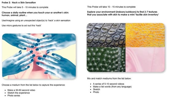 This phase centred on the development and launch of the interactive skin probe pack. A set of seven creative probes (or tasks) were designed as a provocative research tool to facilitate participants (and researchers) to explore the social and sensory aspects of the skin in novel creative ways to open new spaces for research/design and to gain an impressionistic account of participants’ associations and beliefs, social and cultural concerns, and to probe the past and present to re-imagine the future []. To do this, the probe pack was designed to bring Phase 1 emergent themes (primarily from HCI/design) into conversation with key concepts from skin studies (a subfield of body studies which brings the body’s surface into focus). Skin studies are informed by a transdisciplinary approach drawing on a social science and humanities perspectives as well as critical race studies, gender and sexuality studies, and sensory studies []. Both these perspectives, albeit differently, engage with skin in terms of its temperature and durability, its many felt properties (e.g., soft, reactive, hard, conductive, stretchy, thin, thick and layered) and its malleable, adaptable and flexible character. The rich vocabulary of the skin and five critical concepts from skin studies (introduced below) provided potential points of connection with interactive skin research (based in HCI).